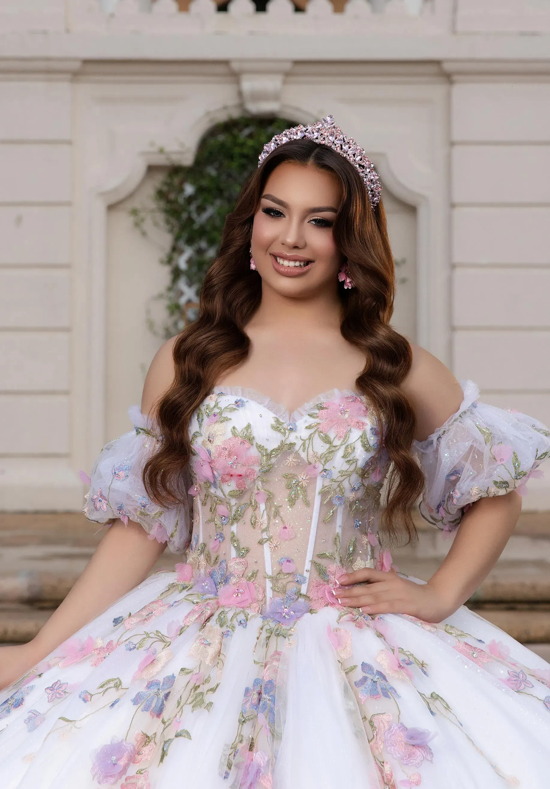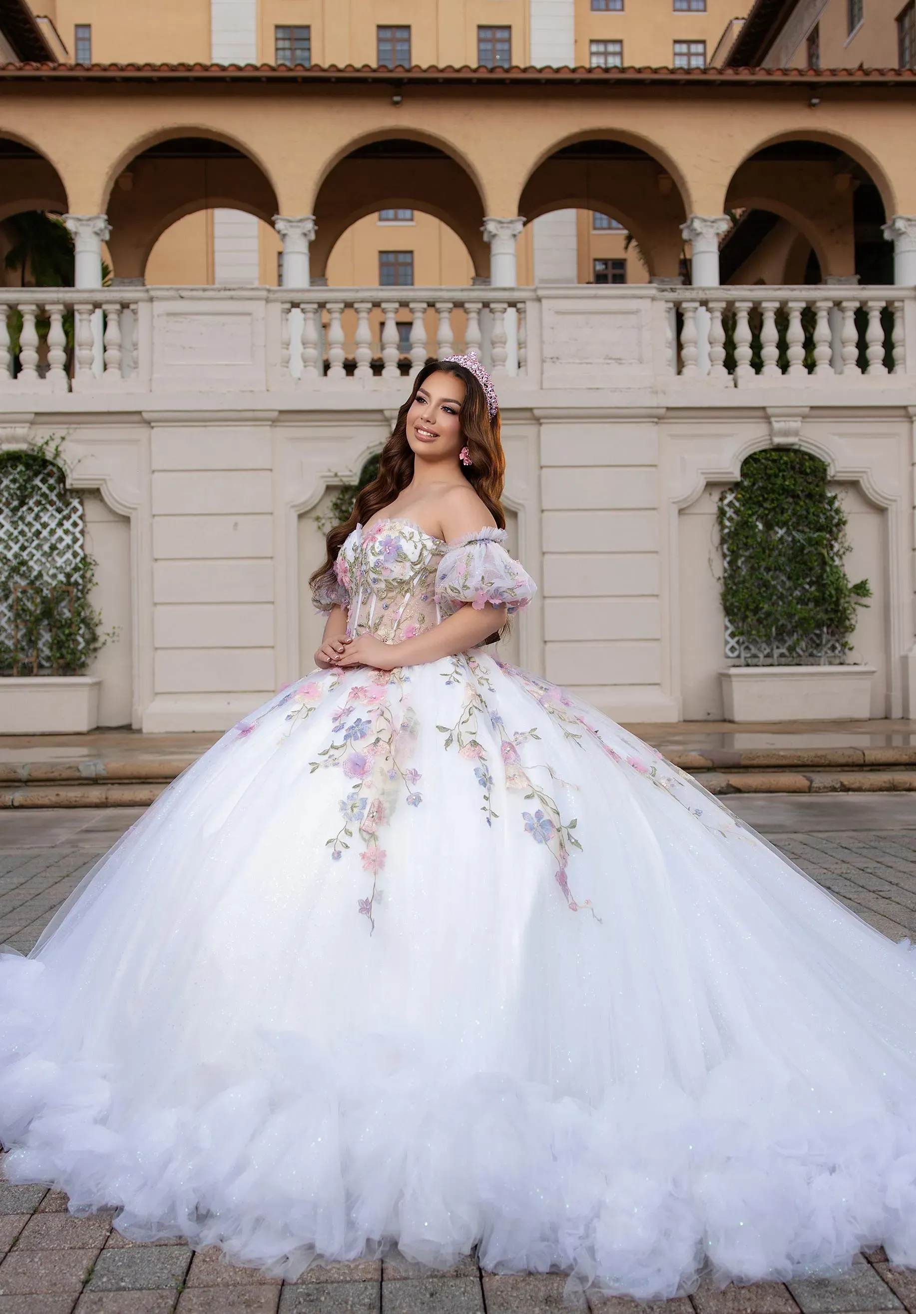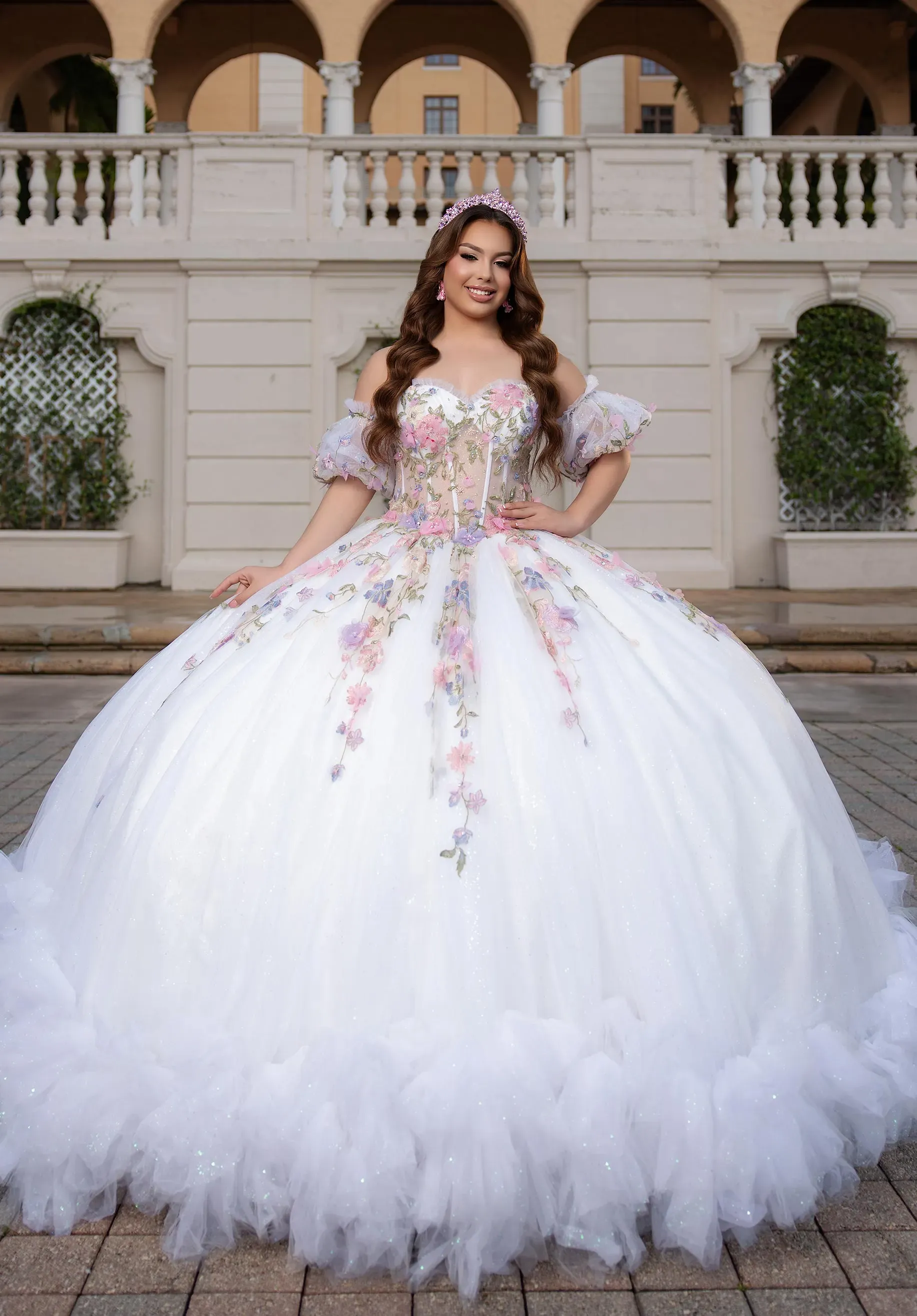 Whimsical quinceañera ball gown has a sheer corset bodice with a sweetheart neckline featuring frilled ruffle trim. Multicolor floral appliqués float down the full tulle dress, with its basque waist, textured ruffle hem, and detachable pouf sleeves that add to the fairytale feel. Matching stole included.