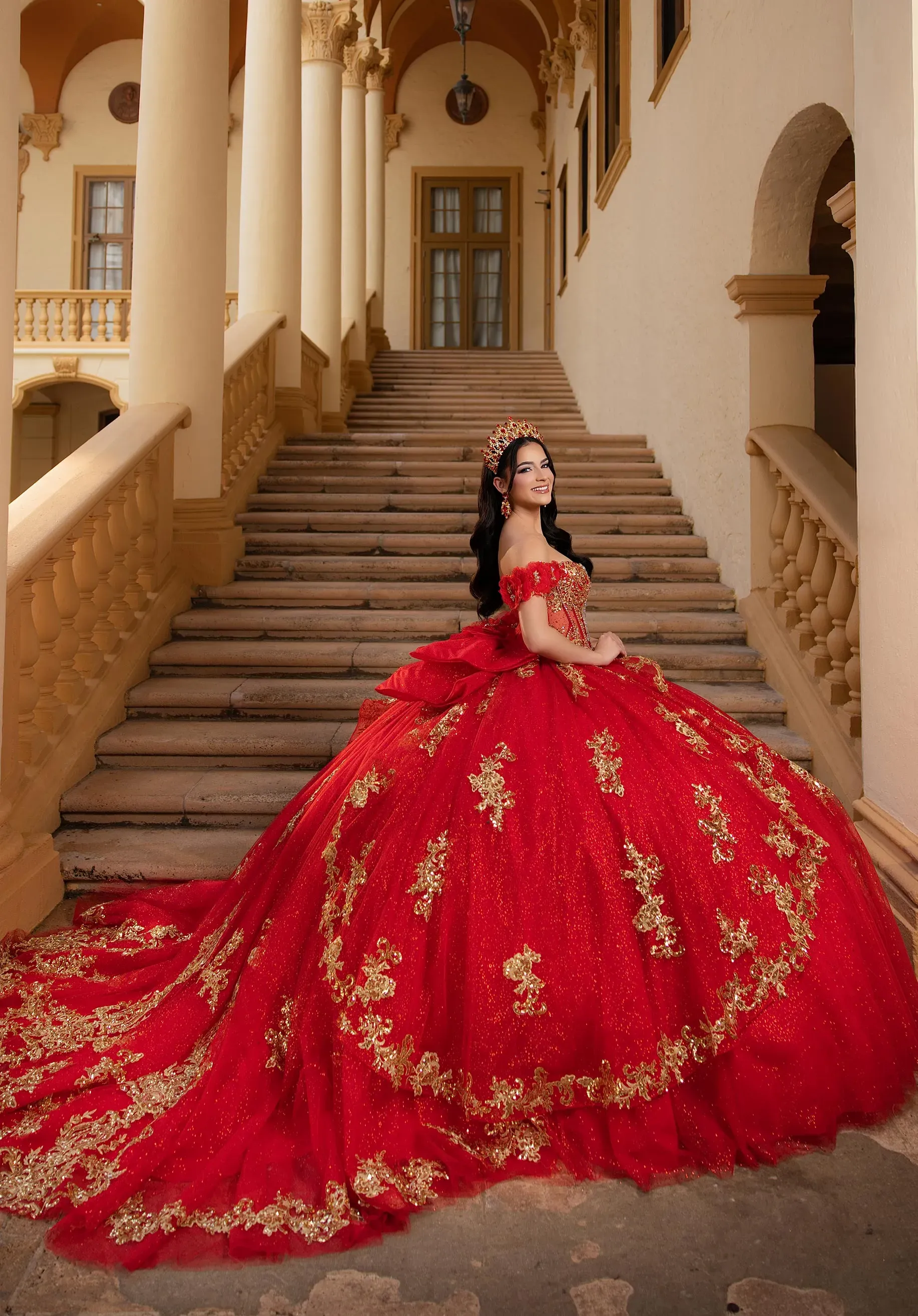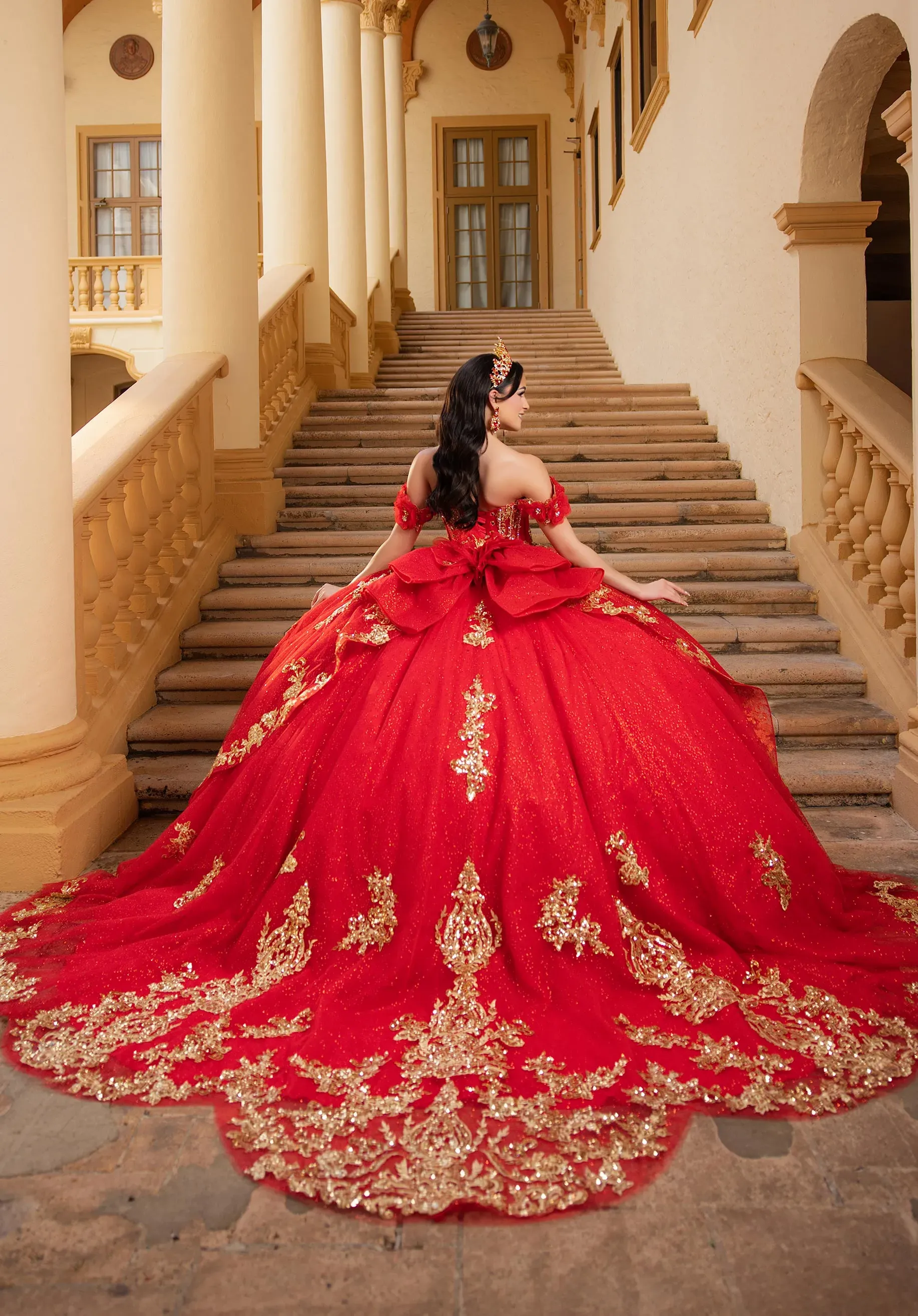 Embellished quinceañera ball gown has a blingy beaded bodice with a strapless scoop neckline and corset boning, that leads to the basque waist, with glamorous crystal trim. Shimmering sequin appliqués have a swirling design on the glitter tulle skirt, with a split skirt overlay and breathtaking scalloped train. Three-dimensional florals accent the detachable off-the-shoulder sleeves with a large rosette on the sweet back bow. Matching stole included.